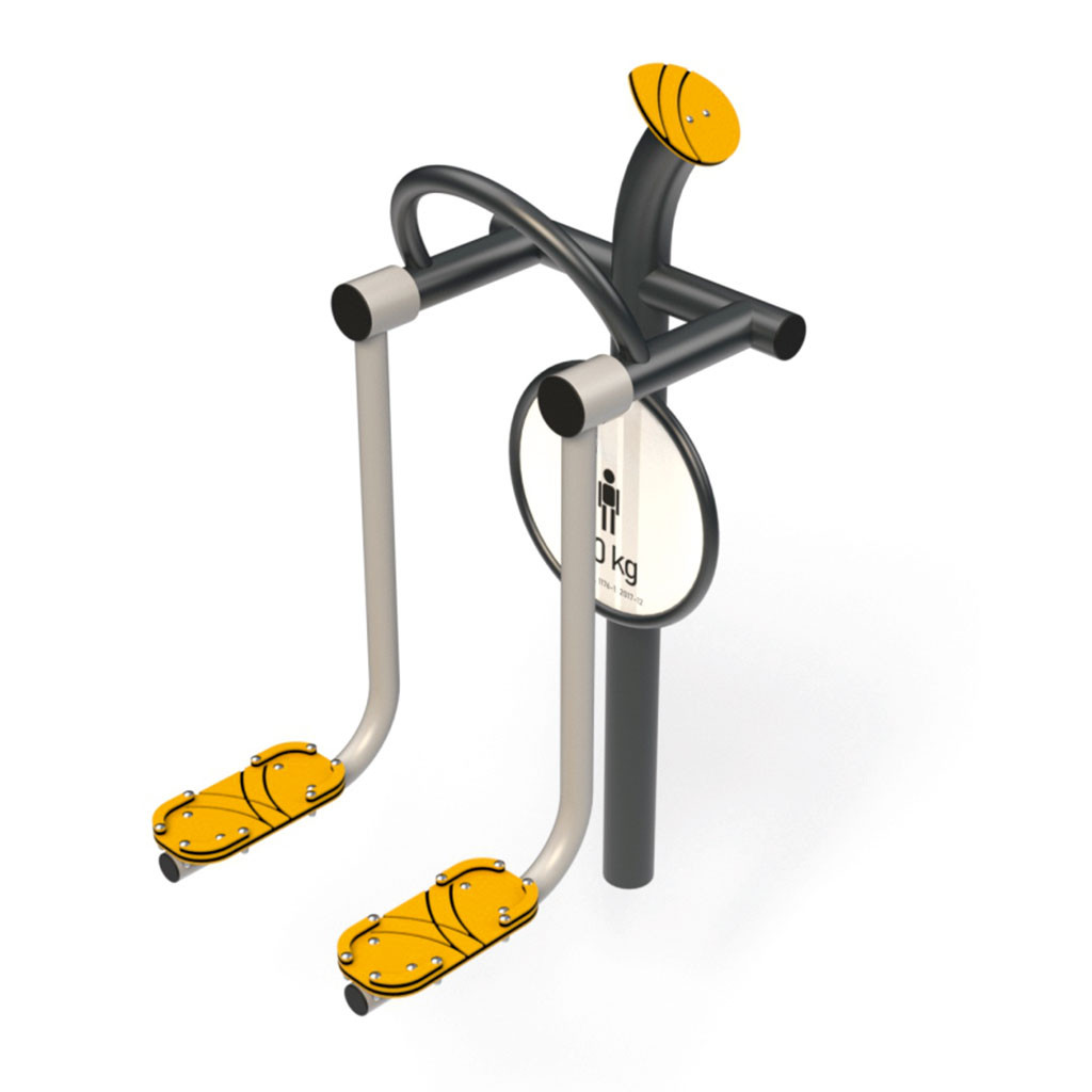 Význam cvičenia: Fitnes zariadenie je určené na posilnenie vnútorných a vonkajších stehien. Pri cvičení sa dieťa učí lepšej koordinácii pohybov, zlepšuje stabilitu tela. Návod na použitie: Dieťa oboma rukami chytí rukoväť v tvare poloblúka a postaví sa na plošinky. Začne tlačiť chodidlá na protiľahlé strany. Je dôležité mať počas cvičenia vzpriamený chrbát a vykonávať plynulé pohyby. Bezpečnostná zóna: 375 x 413 cm. Prevádzkové pokyny: Fitness zariadenia sú určené pre deti do výšky 140 cm a váhy 80 kg. Zariadenie je určené na rekreačné cvičenie pre jedno dieťa, ktoré môže cvičiť len pod dohľadom dospelej osoby. Pri používaní tohto zariadenia musia byť dohliadajúce osoby oboznámene s prevádzkovým poriadkom a musia ho dodržiavať. Osoba, ktorá dohliada na dieťa na cvičebnom zariadení, si musí byť vedomá zdravotného stavu dieťaťa a jeho fyzických možností. Druh dopadovej plochy podľa EN 16630: tráva, ornica, riečny štrk, gumená podlaha. PLÁN KONTROL: Vizuálna kontrola - 1 - krát týždenne vykonaná prevádzkovateľom Prevádzková kontrola – 4 - krát ročne vykonaná prevádzkovateľom Ročná hlavná kontrola – 1- krát ročne vykonaná oprávnenou osobou