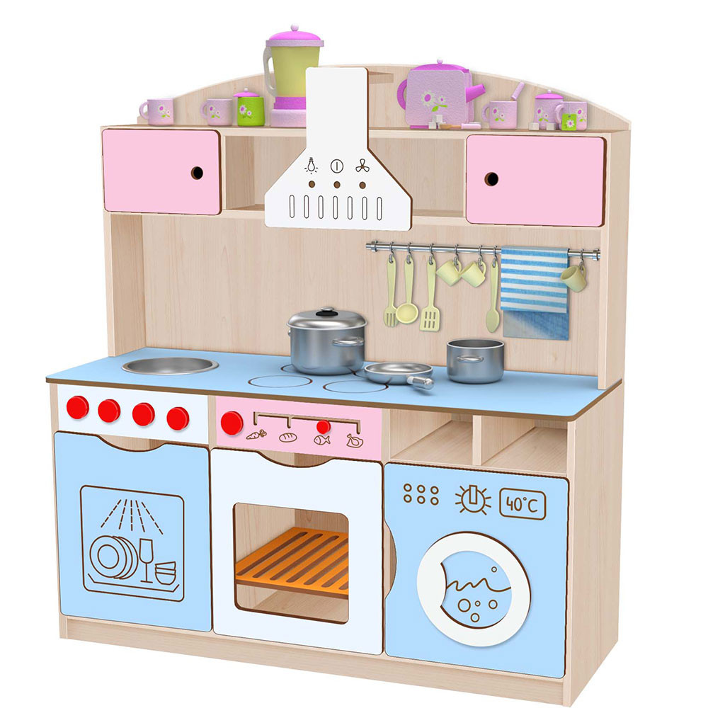 Detská kuchynka je vyrobená z 18 mm DTD dosky a má zaoblenú bezpečnostnú ABS hranu s hrúbkou 2 mm. Na výber máte korpus javor alebo buk. Dvierka sú vyrobené zo 12 mm MDF dosky. Na dvierka sa dajú frézovať vzory. Kombinácia modulov - rúra, mikrovlnka, umývačka riadu, digestor. Do dvierok rúry je vložený rosť z 12 mm MDF. V cene kuchynky je aj nerezová miska a tyč na vešanie kuchynského riadu.