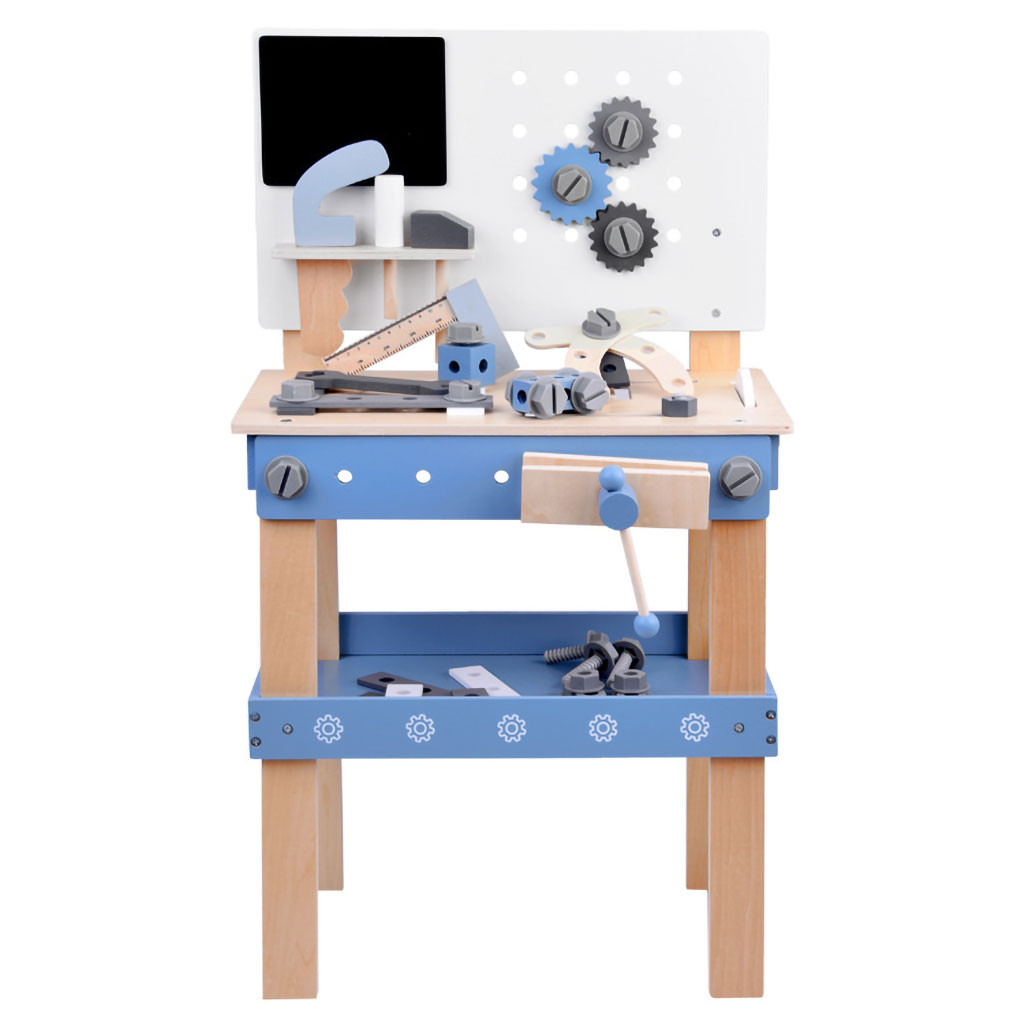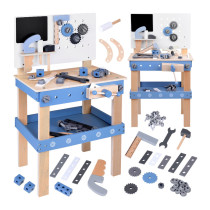 Drevená dielňa je navrhnutá tak, aby rozvíjala manuálne zručnosti a predstavivosť detí a zároveň ich zoznámila so svetom náradia a majstrovania. Dielňa je vyrobená z masívneho dreva, je odolná a bezpečná. Obsah balenia: skrutky, ozubené kolesá, dosky na kľúče, ručná píla, zverák, kladivo, skrutkovač a ďalšie príslušenstvo. Po ukončení hry všetky diely deti uložia do úložného priestoru v dolnej čast pracovného stola. Sada umožňuje neobmedzené skrutkovanie, pribíjanie a montáž a tiež učí organizácii práce. Hra s dielňou podporuje rozvoj manuálnej zručnosti, motorickej koordinácie, kreatívneho a logického myslenia. Všetky prvky sú zaoblené a potiahnuté netoxickou farbou bezpečnou pre deti. Dielňa je dodávaná v demonte, je nutné ju zmontovať. Rozmery: 67 x 44,5 x 26 cm. Materiál: drevo. Vek: 3+.