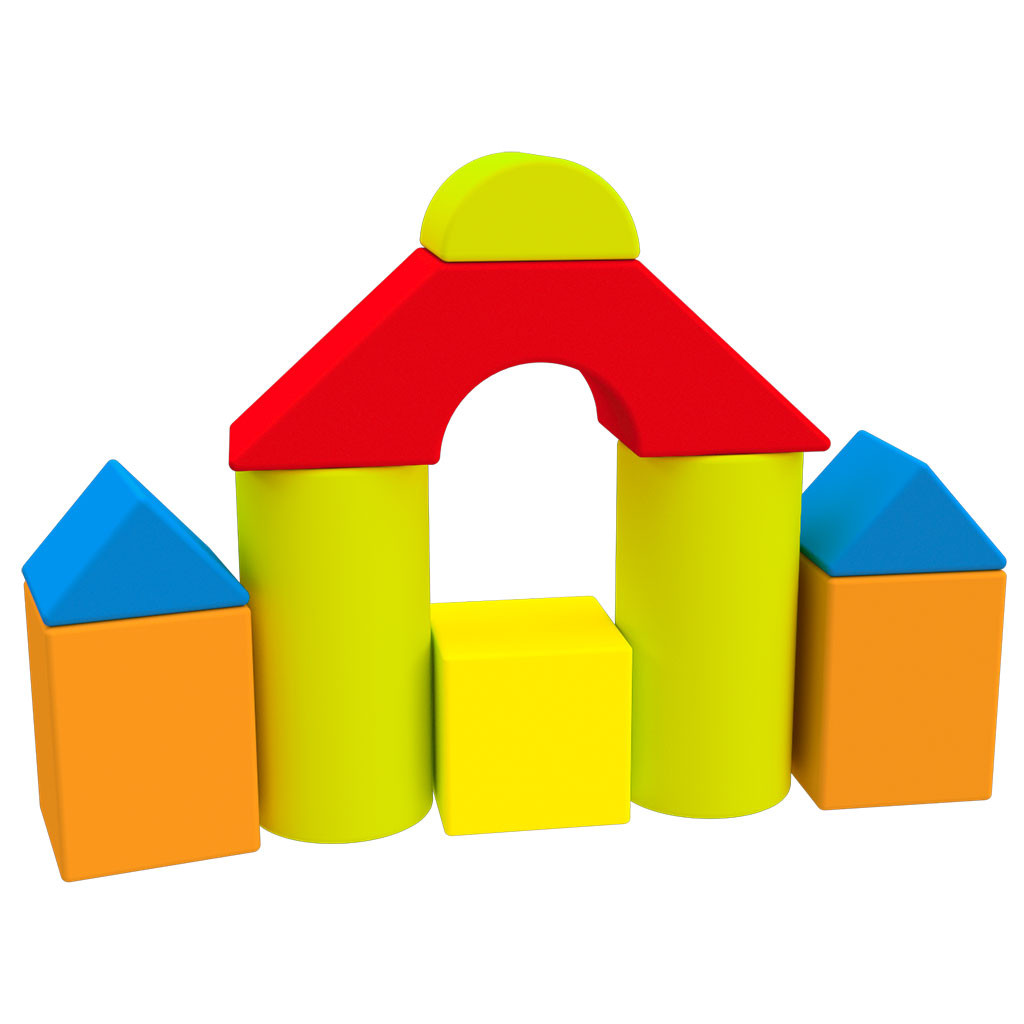 2 x hranol 33 x 25 x 25 cm, 2 x malá strieška 25 x 15 x 15 cm, 2 x valec priemer 25 cm - výška 50 cm, 1x kocka 25 x 25 x 25 cm, 1x strieška s oblúkom 75 x 25 x 25 cm, 1 x polkruh 25 x 25 x 12 cm