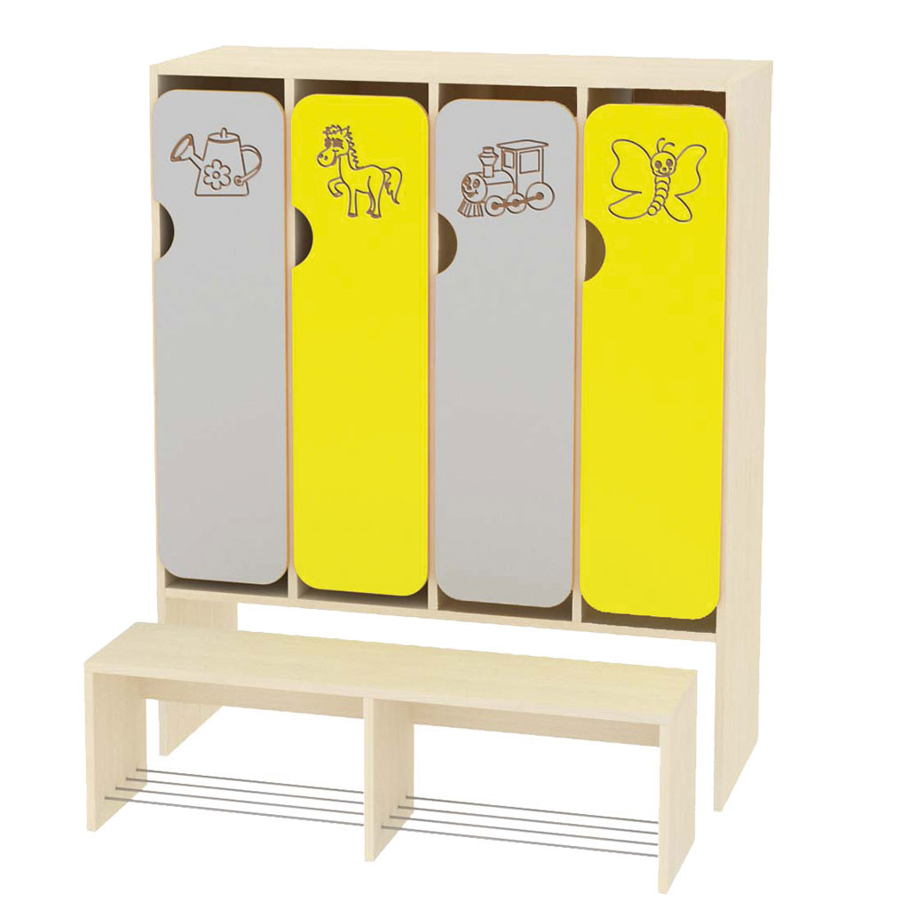 Šatne sú vyrobené z 18 mm DTD dosky, ktorá má zaoblenú ABS bezpečnostnú hranu s hrúbkou 2 mm. Dvierka sú vyrobené zo 12 mm MDF dosky, majú zaoblenú hranu. Na dvierka sa dajú frézovať vzory, na výber máte 92 motívov. Súčasťou šatne je odnímateľná lavička s roštom. Každá priehradka má jeden dvojitý háčik, ktorý si, za príplatok 3 € na jednu bunku, môžete zameniť za tyč na ramienko. V tom prípade za kód pripíšte písmeno T. Vybrať si môžete korpus javor alebo buk.