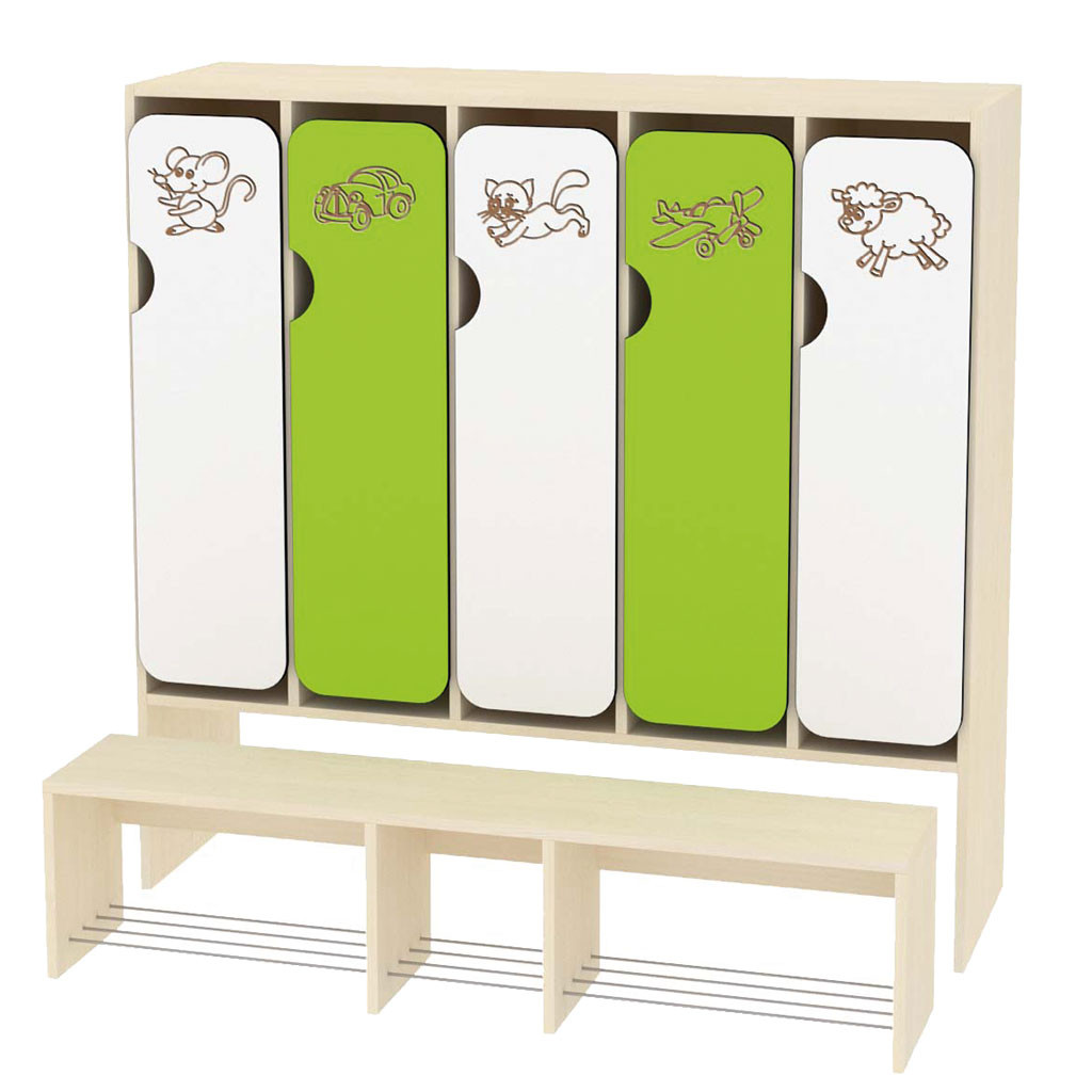 Šatne sú vyrobené z 18 mm DTD dosky, ktorá má zaoblenú ABS bezpečnostnú hranu s hrúbkou 2 mm. Dvierka sú vyrobené zo 12 mm MDF dosky, majú zaoblenú hranu. Na dvierka sa dajú frézovať vzory, na výber máte 92 motívov. Súčasťou šatne je odnímateľná lavička s roštom. Každá priehradka má jeden dvojitý háčik, ktorý si, za príplatok 3 € na jednu bunku, môžete zameniť za tyč na ramienko. V tom prípade za kód pripíšte písmeno T. Vybrať si môžete korpus javor alebo buk.