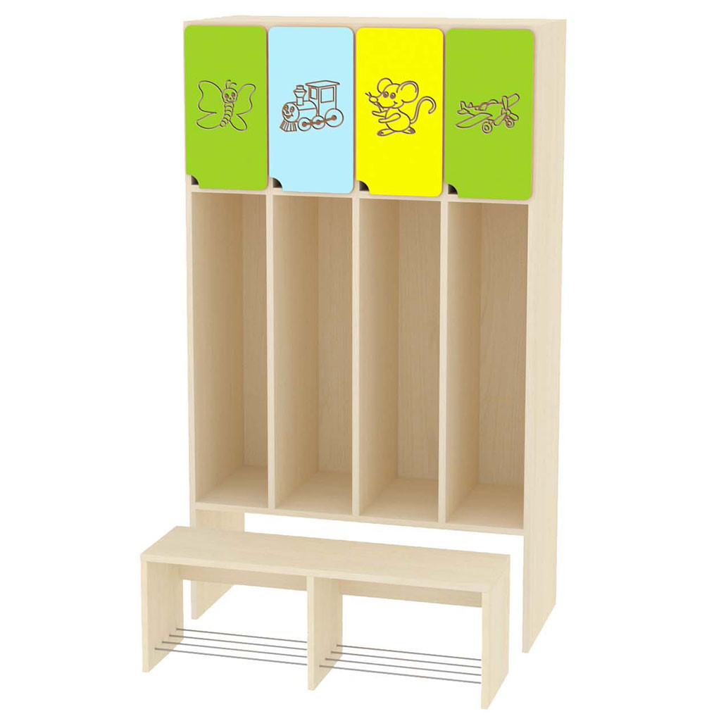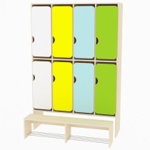 Šatne sú vyrobené z 18 mm DTD dosky, ktorá má zaoblenú ABS bezpečnostnú hranu s hrúbkou 2 mm. Dvierka sú vyrobené zo 12 mm MDF dosky, majú zaoblenú hranu. Na dvierka sa dajú frézovať vzory, na výber máte 92 motívov. Súčasťou šatne je odnímateľná lavička s roštom. Každá priehradka má jeden dvojitý háčik, ktorý si, za príplatok 3 € na jednu bunku, môžete zameniť za tyč na ramienko. V tom prípade za kód pripíšte písmeno T. Vybrať si môžete korpus javor alebo buk.