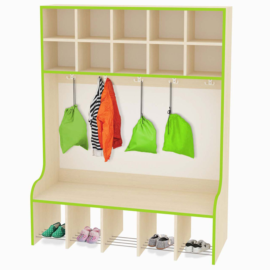 Šatňa vyrobená z 18 mm DTD dosky, ktorá má zaoblenú ABS bezpečnostnú hranu s hrúbkou 2 mm. Súčasťou šatne je pevná lavička s roštom na odloženie obuvi. Každá priehradka má jeden dvojitý háčik. Vybrať si môžete korpus javor alebo buk.