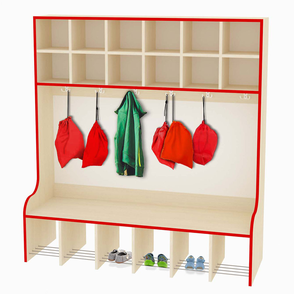 Šatňa vyrobená z 18 mm DTD dosky, ktorá má zaoblenú ABS bezpečnostnú hranu s hrúbkou 2 mm. Súčasťou šatne je pevná lavička s roštom na odloženie obuvi. Každá priehradka má jeden dvojitý háčik. Vybrať si môžete korpus javor alebo buk.