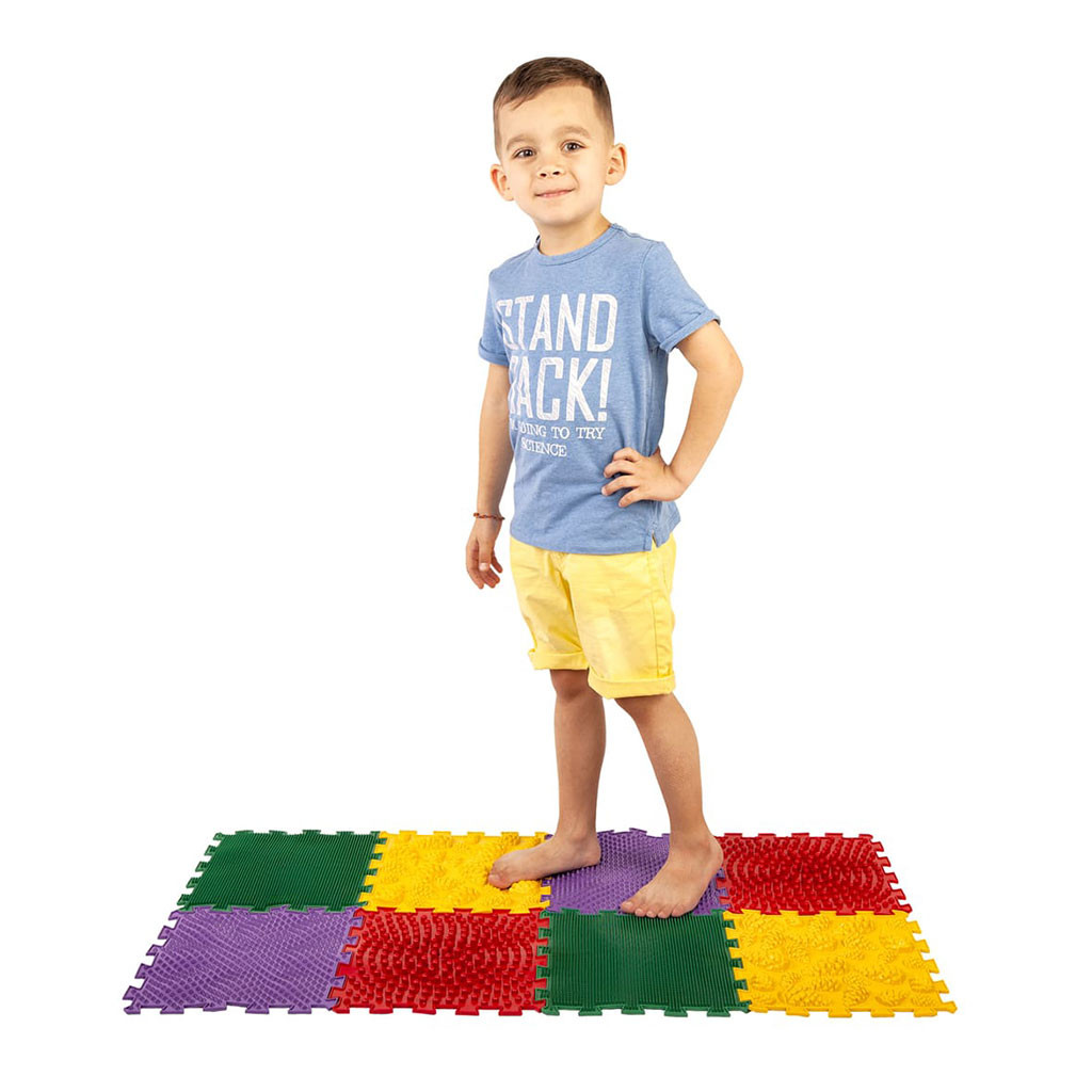 Ortopedické puzzle sa skladajú z jednotlivých dielikov, ktoré sa spájajú ako “puzzle”. Jedinečnosť podložky spočíva v striedaní mäkkých a tvrdých povrchov. Táto kombinácia zabezpečuje stimuláciu všetkých potrebných receptorov chodidla. Prispieva k správnemu formovaniu klenby. Podložka prispieva k rozvoju jemnej motoriky a kognitívnych schopností. Súprava sa dodáva s letákom, ktorý obsahuje prehľad cvičení. Pomáha pri príznakoch rôznych deformácií chodidla, pri plochých nohách, hypertónii a hypotónii svalov nôh. Rôzne povrchy a úrovne tuhosti masážnych prvkov zabezpečujú zdravý vývoj klenby nohy a správne držanie tela dieťaťa. Rozdiely medzi prvkami rohože zvyšujú tlak na nervové zakončenie chodidla a zaisťujú mu akupresúru. Každá časť podložky má protišmykové prvky a obsahuje aj uzamykací systém, vďaka ktorému sa jednotlivé časti od seba neoddeľujú. Výhodou podložky je, že sa ľahko umýva a udržiava. Puzzle sú vyrobené z hypoalergénneho materiálu, prešli klinickými testami aj testami toxicity a sú považované za zdravotnícku pomôcku. Balenie obsahuje 8 ks. Rozmery 1 ks: 25 x 25 cm. Materiál: 100% PVC. Vek: 1+.