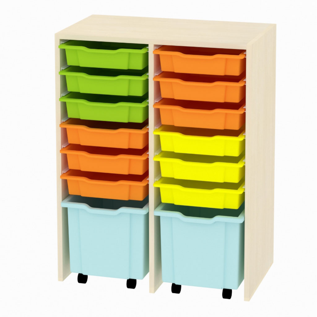 Skrinka je vyrobená z 18 mm DTD dosky, ktorá má zaoblenú ABS bezpečnostnú hranu o hrúbke 2 mm. Na výber máte korpus javor alebo buk.  Ceny skriniek sú bez plastových kontajnerov a vodiacich líšt. Kontajnery a lišty sa objednávajú samostatne.