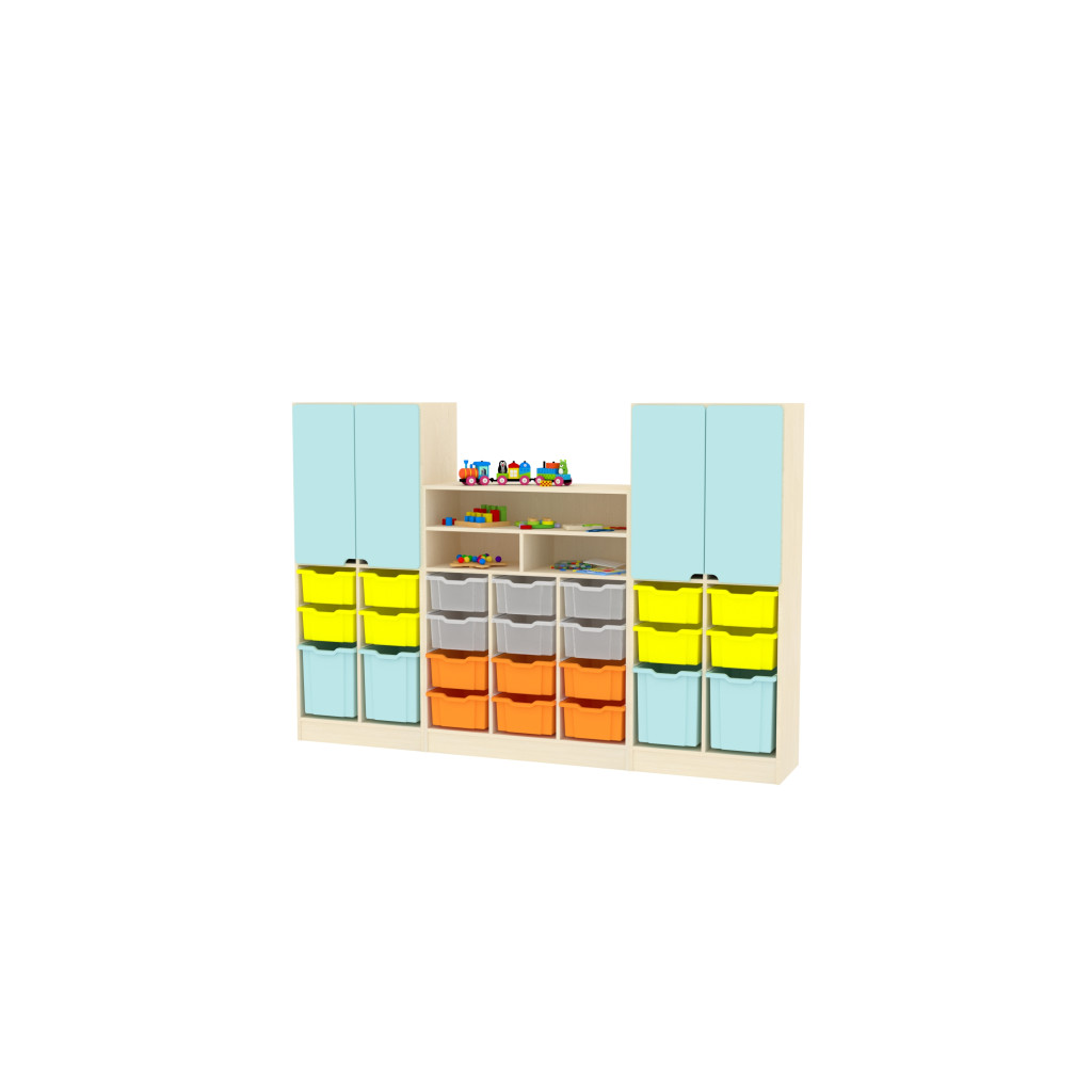 3D Zostavy sú vyrobené z 18 mm DTD dosky, ktorá má zaoblenú ABS bezpečnostnú hranu s hrúbkou 2 mm. Dvierka sú vyrobené zo 16 mm MDF dosky, sú potiahnuté farebnou fóliou a tiež majú zaoblenú hranu. Vybrať si môžete korpus javor alebo buk. Máte možnosť vybrať si zostavu podľa nášho návrhu, (obrázok), alebo si vytvoriť vlastnú zostavu kombináciou 3D skriniek z našej ponuky, farebností a motívov podľa vašich potrieb. Na výber máte 9 farieb , 92 samostatne frézovaných motívov,  41 príbehov a nespočetné množstvo kombinácií. Cena je bez matracov v domčekoch(možnosť výberu farby), kontajnerov Gratnells a vodiacích líšt - možnosť výberu farby.