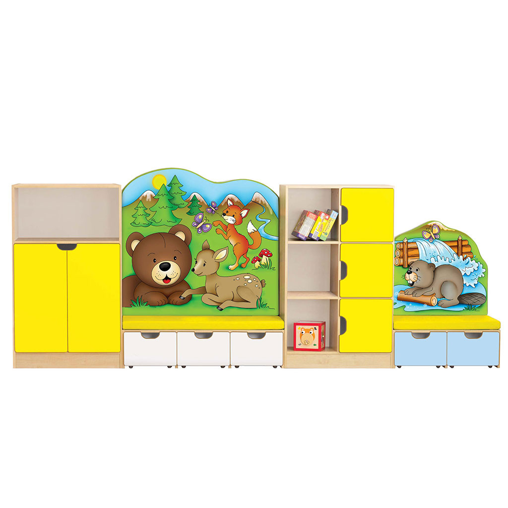 Nábytkové zostavy Molitánik sú vyrobené z 18 mm DTD dosky, ktorá má zaoblenú ABS bezpečnostnú hranu s hrúbkou 2 mm. Dvierka sú vyrobené zo 12 mm laminovanej MDF dosky, majú zaoblenú hranu. Vybrať si môžete korpus javor alebo buk. Máte možnosť vybrať si zostavu podľa nášho návrhu, (obrázok), alebo si vytvoriť vlastnú zostavu kombináciou skriniek podľa vašich potrieb. V cene zostavy sú aj dekoračné molitany a matrace na sedacích skrinkách. V ponuke máme 5 farieb matracov a rôzne dekoračné molitany, ktoré si tiež môžete skombinovať podľa vašich predstáv.