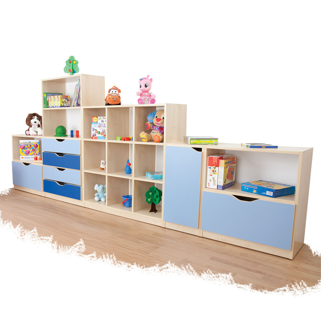 Nábytkové zostavy MULTI sú vyrobené z 18 mm DTD dosky, ktorá má zaoblenú ABS bezpečnostnú hranu s hrúbkou 2 mm. Dvierka a čela kontajnerov sú z 12mm laminovanej MDF dosky Vybrať si môžete korpus javor alebo buk. Máte možnosť vybrať si zostavu podľa nášho návrhu, (obrázok), alebo si vytvoriť vlastnú zostavu kombináciou skriniek a farebností podľa vašich potrieb. Zostavy sa skladajú z praktických skriniek, ktoré jednoduchým presunutím môžete umiestniť v priestore a vytvoriť tak rôzne zóny.